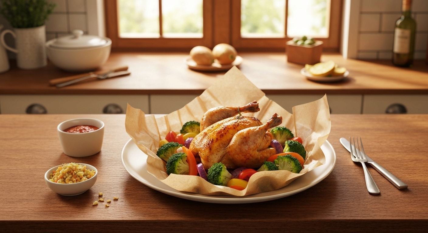 9. Retire do forno e transfira os papelotes diretamente para os pratos. Abra com cuidado, pois o vapor estará quente.